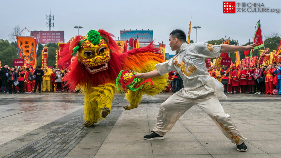 2018年3月2日拍攝于武漢市東西湖區(qū)。從春節(jié)到元宵燈節(jié),許多地方都有舞獅的習俗,武漢市東西湖區(qū)的迎新年活動。[攝影:于琳]