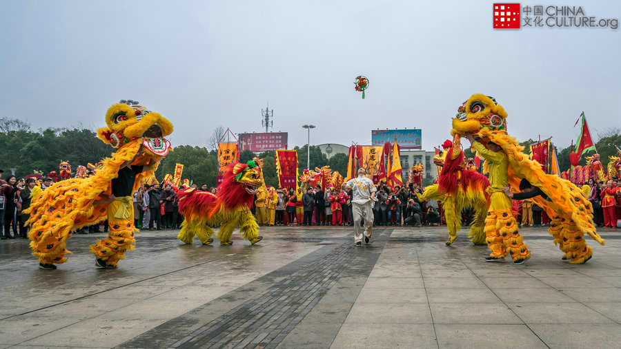 2018年3月2日拍攝于武漢市東西湖區(qū)。從春節(jié)到元宵燈節(jié),許多地方都有舞獅的習(xí)俗,武漢市東西湖區(qū)的迎新年活動(dòng)。[攝影:于琳]