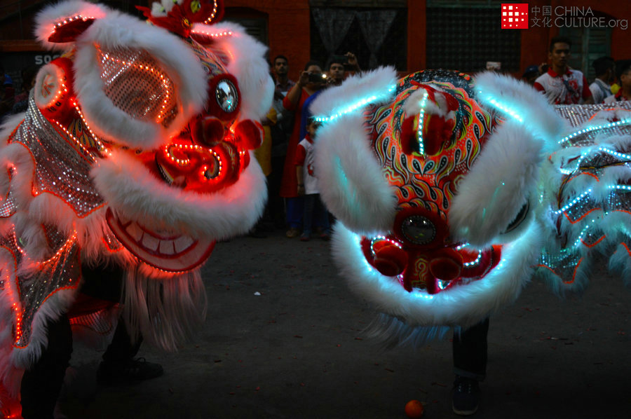 Photo taken at Bow Barracks, Central Kolkata, India on Feb 16, 2018. The modern Chinese LED light lion dance was performed as a  rituals of Chinese New Year at Bow Barracks, Central Kolkata, India. [Photo by Mayukh Mitra]