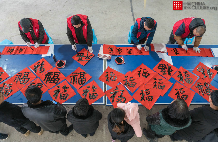 2020年1月15日拍攝于重慶市巫溪縣城廂鎮(zhèn)。2020年春節(jié),重慶市巫溪縣,書法志愿者免費為貧困戶書寫春聯(lián)。[攝影:董晏]
