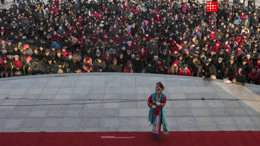 2018年2月19日拍攝于山東省滕州市龍泉廣場?!皻g樂滕州嘉年華”大拜年活動上,滕州市柳琴劇團(tuán)在龍泉廣場演出的柳琴戲,市民在家門口就能享受戲曲文化大餐。改革開放以來,人民日益增長的文化需求不斷得到滿足。[攝影:李立]