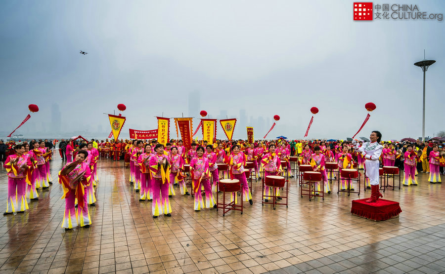 2019年2月16日拍攝于武漢漢口江灘。正月里,在武漢漢口江灘鑼鼓大拜年活動(dòng)激情上演,一支支富有地方特色的鑼鼓隊(duì)伍輪番登場(chǎng),百鼓齊鳴,氣勢(shì)恢宏,鼓舞蒙山,躍動(dòng)江城。[攝影:于琳]