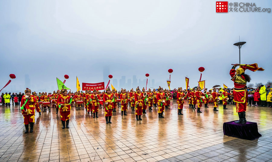 2019年2月16日拍攝于武漢漢口江灘。正月里,在武漢漢口江灘鑼鼓大拜年活動激情上演,一支支富有地方特色的鑼鼓隊(duì)伍輪番登場,百鼓齊鳴,氣勢恢宏,鼓舞蒙山,躍動江城。[攝影:于琳]
