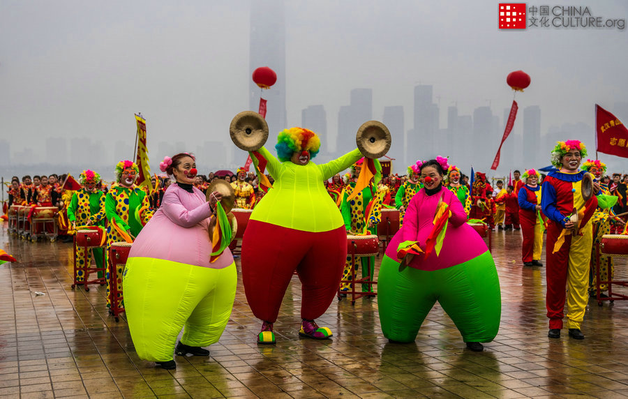 2019年2月16日拍攝于武漢漢口江灘。正月里,在武漢漢口江灘鑼鼓大拜年活動(dòng)激情上演,一支支富有地方特色的鑼鼓隊(duì)伍輪番登場(chǎng),百鼓齊鳴,氣勢(shì)恢宏,鼓舞蒙山,躍動(dòng)江城。[攝影:于琳]