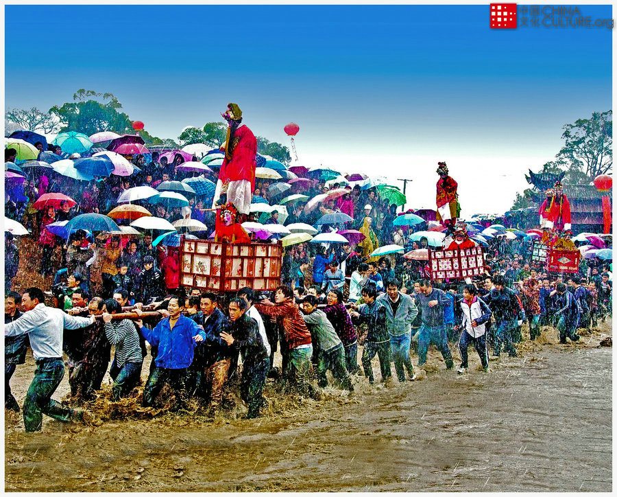 2011年2月17日拍攝于福建連城羅坊。圖為當(dāng)?shù)丶案=ㄊ∈肋z民俗走古事下河競(jìng)渡。[攝影:周其龍]