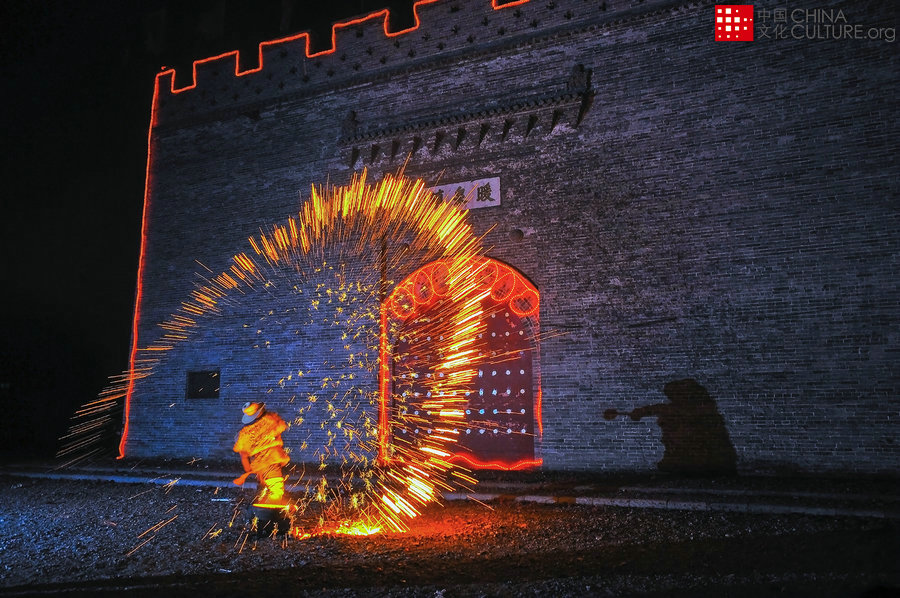 2009年2月8日拍攝于河北省蔚縣暖泉鎮(zhèn)。正月里正在上演當?shù)胤沁z傳統(tǒng)的社火——打樹花。[攝影:張旭]