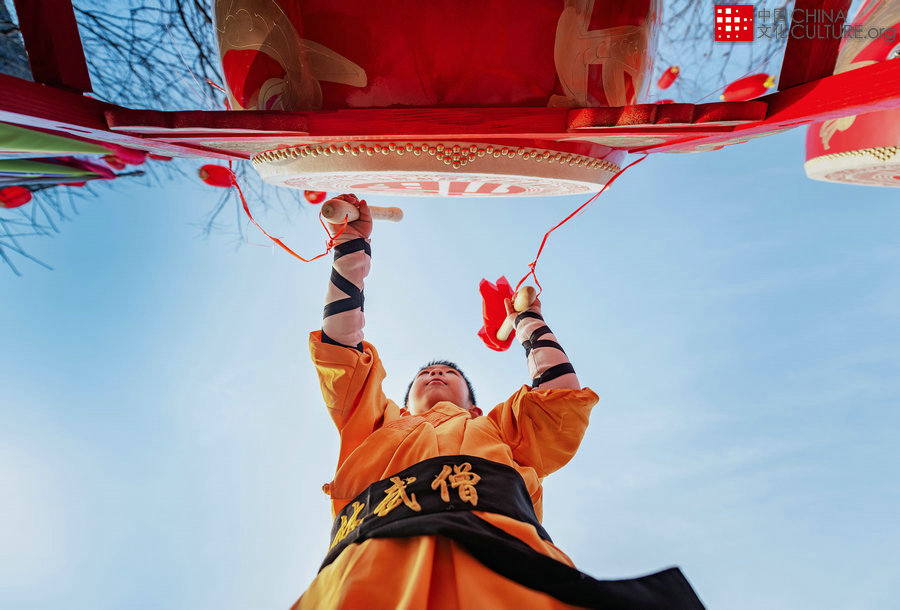 2020年1月17日拍攝于河北省秦皇島市山海關(guān)。古城山海關(guān)內(nèi),一名少林武術(shù)學(xué)校的學(xué)員在天下第一關(guān)下?lián)艄膽c祝新年的到來。[攝影:揣連海]
