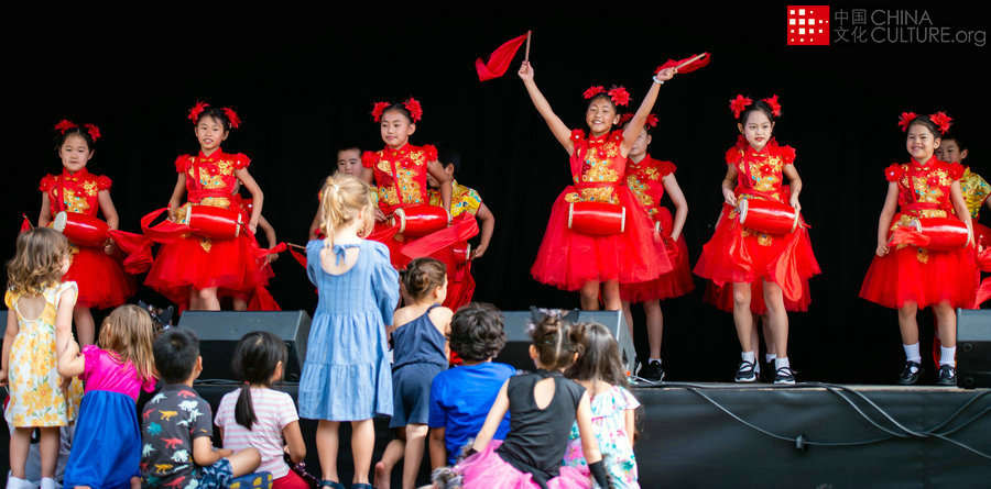2020年1月26日拍攝于新西蘭基督城。新西蘭基督城2020新春嘉年華上,一群中文兒童爬上舞臺觀看中國腰鼓舞。[攝影:朱其平]