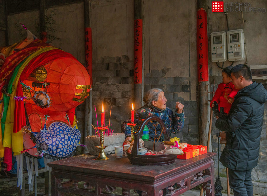 2019年2月16日拍攝于浙江省金華市浦江縣黃宅鎮(zhèn)宅口村。宅口魚燈為省非遺,傳承民俗文化內(nèi)涵,長(zhǎng)者點(diǎn)香火燭,紙線,持香行禮,代代傳承,百生姓喜洋洋,快樂(lè)過(guò)大新年。[攝影:高嵩]
