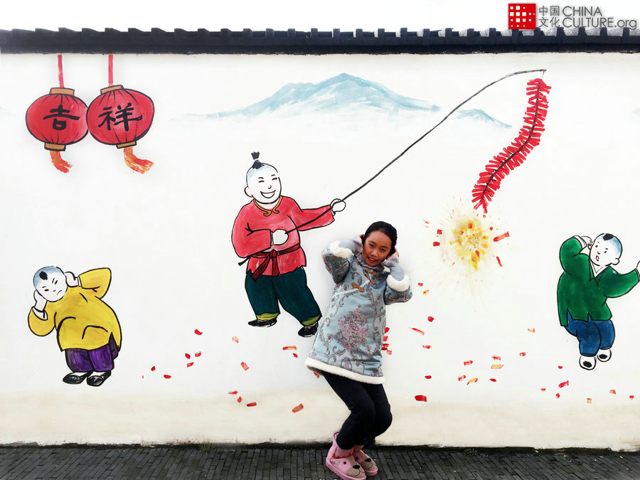 2019年2月6日拍攝于江蘇省海門市余東古鎮(zhèn)。大年初二,孩子們在余東老街游玩,一幅放煙花爆竹涂鴉畫,吸引小朋友紛紛駐足,借景留念。[攝影:施敏]