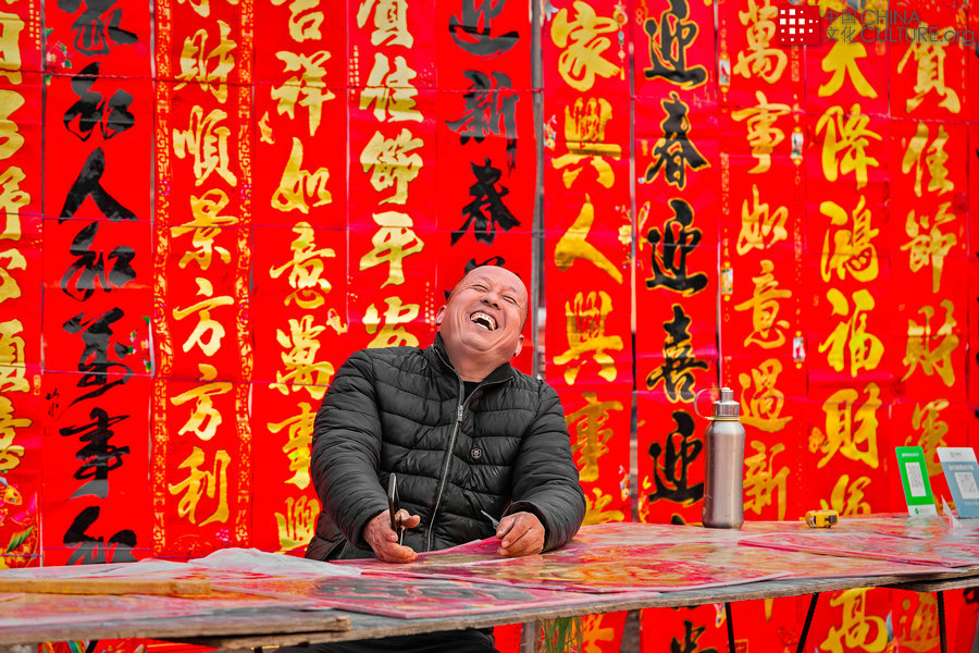 2020年1月22日拍攝于河北邯鄲市肥鄉(xiāng)縣。賣對聯(lián)的老板,看來今年的生意不錯,因為一句祝福的話語,老板瞬間的開心笑容。[攝影:郭偉]