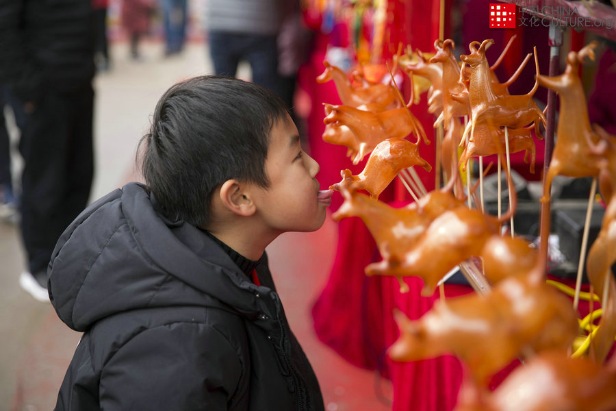 2019年2月19日拍攝于河南省開封市萬歲山廟會。吹糖人的藝人們工作很辛苦,夏天一身汗,冬天一身冷。寒來暑往,吹糖人以精湛的技藝為游客們展現了中國非物質文化遺產的獨特魅力,給孩子們留下了無限遐想,也給游客們帶來了更多回味。[攝影:趙軍]