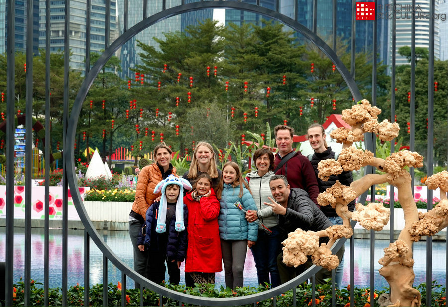 2020年1月19日拍攝于廣州市花城廣場。今年春節(jié),廣州市舉行地二十七屆園林博覽會(huì),吸引不少來廣州旅游觀光的游客參觀,他們興致勃勃地合影留念。[攝影:梁向前]