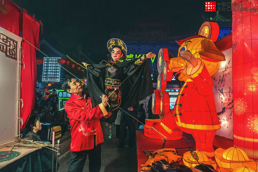 2018年春節(jié)拍攝于山西太原。春節(jié)期間,民間藝人用人偶為民眾表演賀歲。[攝影:索建設(shè)]