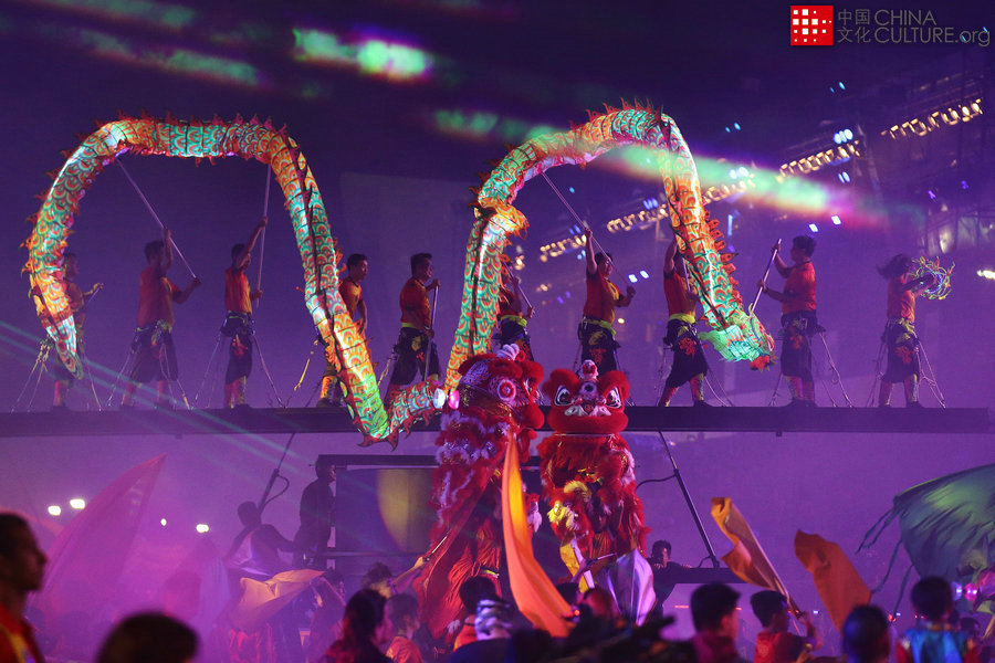 Photo takend at the F1 Pit Building in?Singapore on Jan 31, 2020. A lion and dragon trance troupe perform during the Chingay festival in Singapore. [Photo by Suhaimi Abdullah]