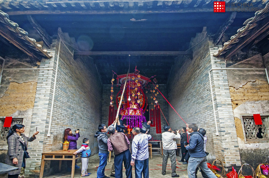 2018年正月十三拍攝于玉林市玉東區(qū)榕樓社區(qū)。傳宗接代、沿續(xù)香火是中國人厚重的傳統(tǒng)情結。而掛燈這一項民俗在位于嶺南的廣西玉林十分盛行。所謂掛燈,就是給在當年正月初十前出生(已滿月)的男孩子掛燈,以示這家添了男丁,增添了香火,后繼有人了。組照描述的是廣西玉林市玉東新區(qū)茂林鎮(zhèn)榕樓社區(qū)泉口屯的掛燈儀式。泉口屯掛燈時間為每年的正月十三。 新的花燈懸掛起來后,各家各戶立馬點火上香,擺上大黃雞茶水酒水等祭祀品,添丁的父母或爺輩們抱著各自的孩子進行祭拜,虔求神靈、社主公和祖宗的保佑,保佑自家新男丁聰明伶利、健康成長。[攝影:曾宜]