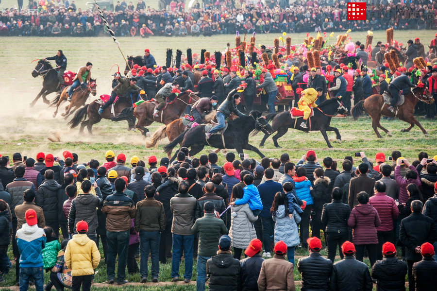2017年2月18日拍攝于河北省南和縣。春節(jié)期間的跑馬活動是中國北方農(nóng)村最激情四射的春節(jié)民俗活動。南和縣精彩的抬皇杠和跑馬表演吸引了眾多的人們前往觀看。[攝影:劉斧修]