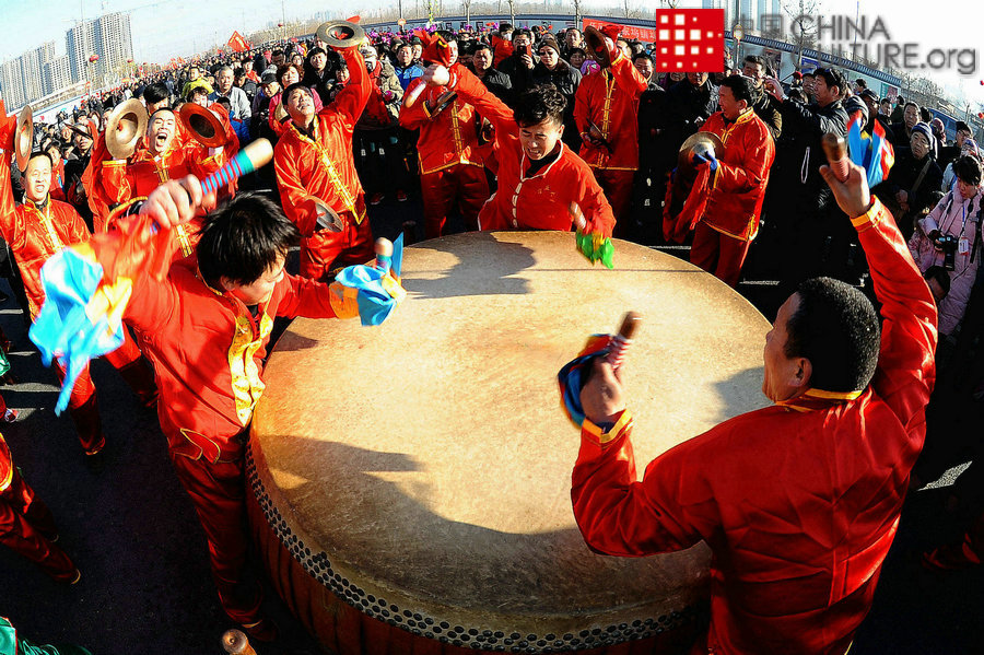2017年2月9日拍攝于河北省任丘縣。每年正月十五,任丘都要舉行規(guī)模宏大的擂鼓迎春活動(dòng)。世代相傳的任丘大鼓響起,人們激情四射,對新的一年的祝愿與希望,都寄托在震耳欲聾的鼓聲中。[攝影:劉斧修]