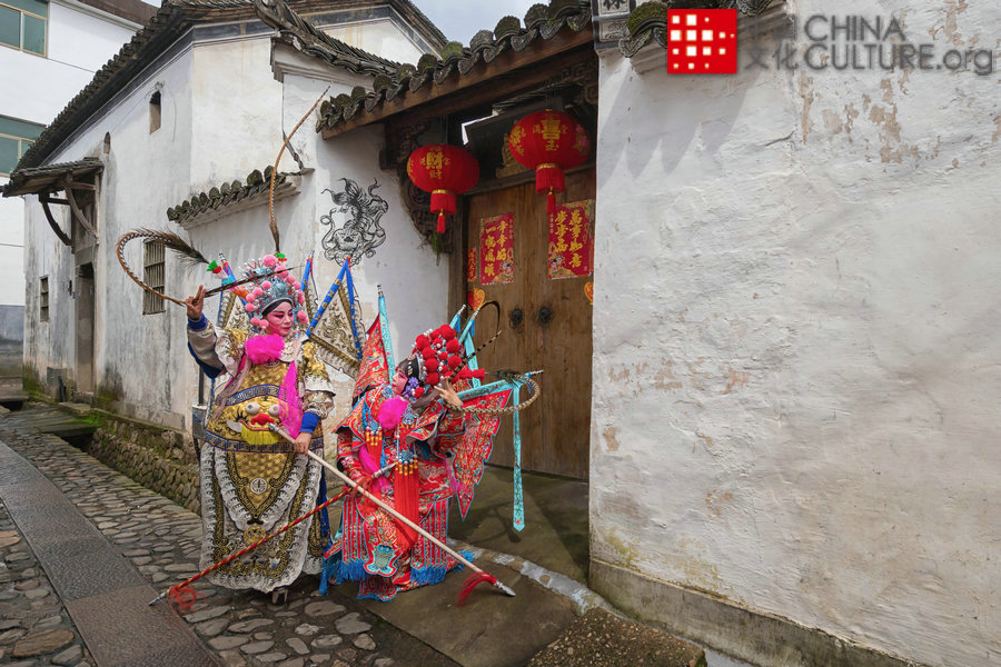 2019年3月6日拍攝于浙江省建德市李村。二月二 龍?zhí)ь^,村里請來戲班子。演員在村里即興表演。[攝影:郭梁勇]