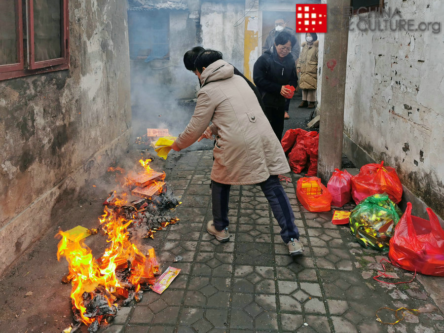 2020年1月24日拍攝于江蘇省南通市寺街。除夕這天是貼春聯(lián)、敬祖宗的民俗習(xí)慣,雖然己開始受非常事件影響,大型慶?;顒右巡桓懔耍簧倮辖质忻袢砸约彝閱挝粴g慶佳節(jié),這里記錄了老巷市民的除夕花絮。[攝影:曹海峰]