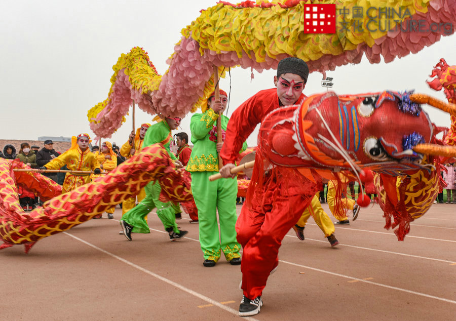 2019年2月18日拍攝于河北滄州。滄州市青縣舊張屯村農(nóng)民春節(jié)期間的舞龍表演。[攝影:王占林]