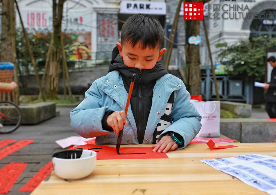 2020年1月21日拍攝于貴州省遵義市紅花崗區(qū)。春節(jié)前夕,遵義市舉辦了豐富多樣的迎春活動(dòng),在公園里,“小書法家”在“老書法家”的帶領(lǐng)下,在公園里免費(fèi)為游人書寫春聯(lián)。[攝影:羅紹玲]
