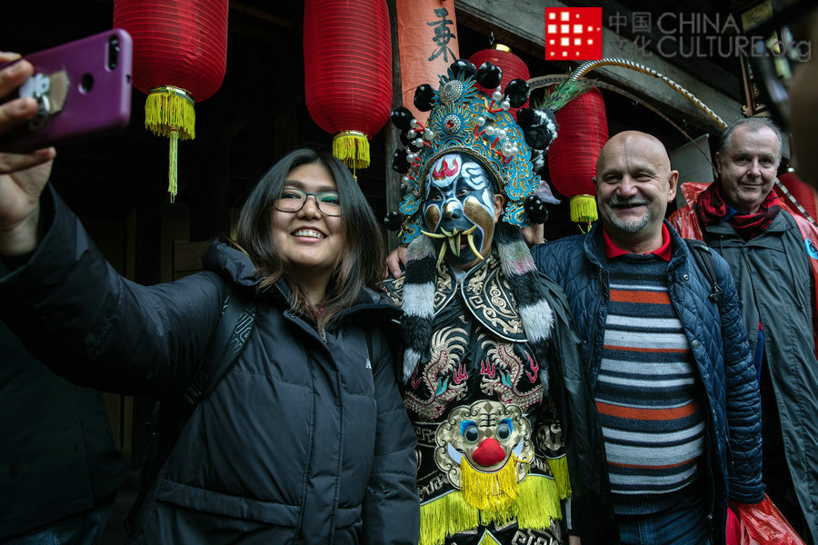 2020年1月11日浙江省寧波市寧海縣前童古鎮(zhèn)。來自俄羅斯、印度、摩洛哥等30多個國家的100多位國際友人應(yīng)邀來到浙江省寧波市寧??h前童古鎮(zhèn),共同體驗原汁原味的中國傳統(tǒng)年俗。圖為來自俄羅斯的友人與寧海耍牙傳承人合影。[攝影:丁紅]
