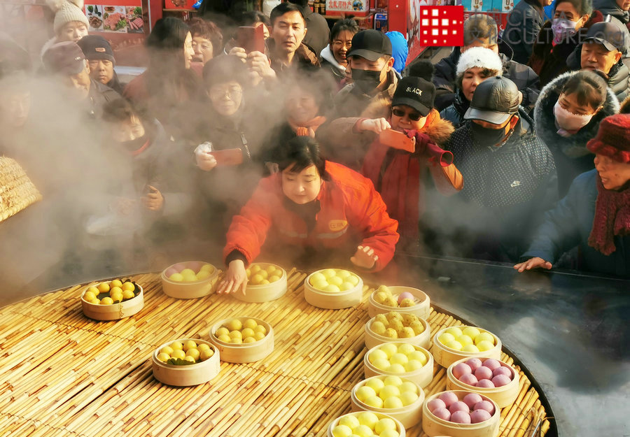 2020年1月拍攝于河北省秦皇島市。河北省秦皇島市年貨大集上,人們?cè)跔?zhēng)相品嘗傳統(tǒng)食品粘豆包。[攝影:邸琳]