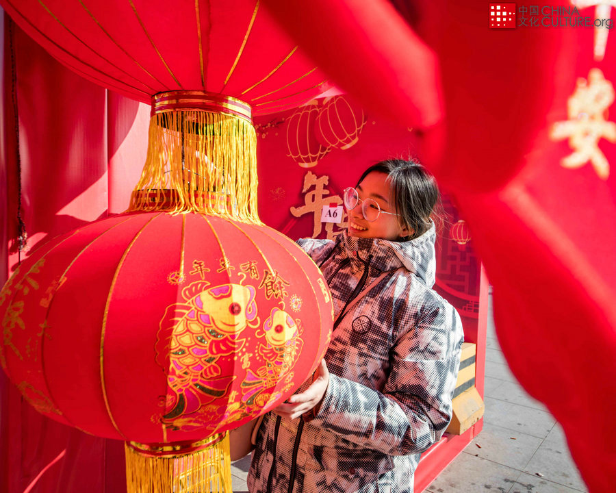 2020年1月14日拍攝于河北省靈壽縣。紅紅火火的年市上,選購大紅燈籠的年輕人露出開心的笑臉。[攝影:劉斧修]