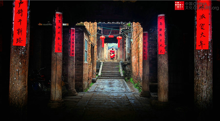2017年2月拍攝于廣西。古宅立柱上貼滿紅色春聯(lián)。[攝影:姜明燈]