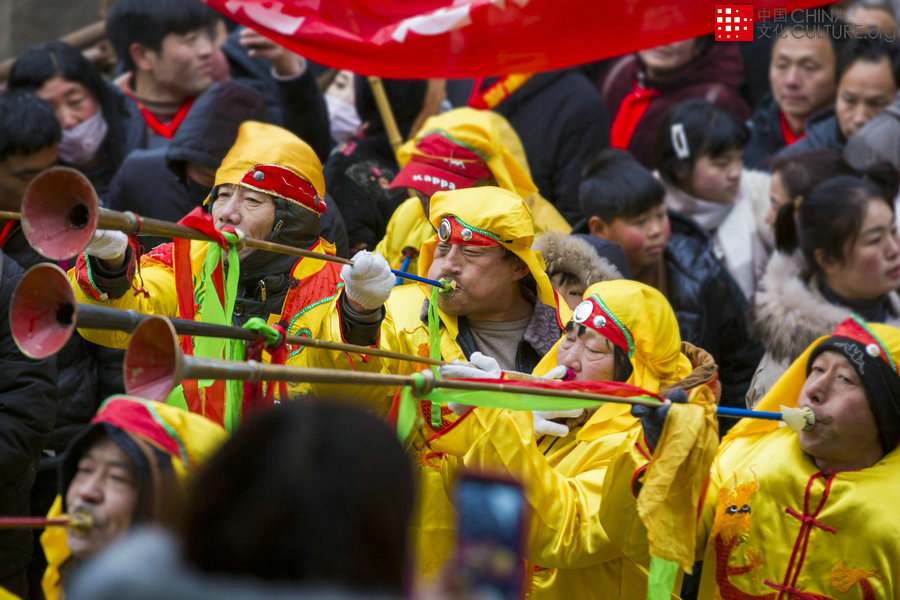 2019年2月19日拍攝于河南省??h古城大呸山廟會。最熱鬧的是正月初九和十六的拜山,初九祭拜大伾山,十六祭拜浮丘山,祭拜那天,從早上四點開始,四鄰八鄉(xiāng)幾十支社火隊早早趕來,一一擺開了架勢,各自拿出自己的看家本領(lǐng),你耍高蹺,我扭秧歌,他練背閣,嗩吶吹,鑼鼓響,空氣都是熱鬧的,一時間,鑼鼓喧天,人聲鼎沸,震耳欲聾。[攝影:趙軍]