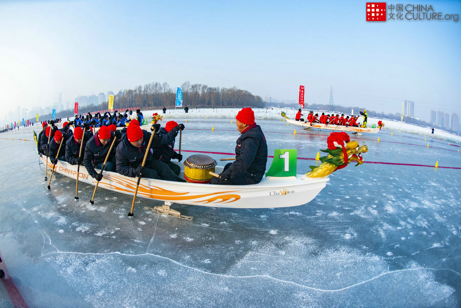 2020年1月3日拍攝于遼寧沈陽市渾河。2020年1月3日,“渾南杯”第二屆中國沈陽國際冰龍舟大賽在沈陽渾河舉行。運動員一起將馬蹄釬插入冰面滑動冰龍舟,冰龍舟在渾河冰面飛速滑行。[攝影:張鵬]