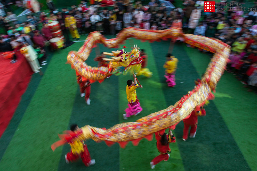 2017年2月12日拍攝于安徽省太和縣縣城。舞龍,又稱玩龍燈,是中華民族的傳統(tǒng)民俗文化活動(dòng),以舞龍的方式來祈求平安和吉祥。舞龍?jiān)醋怨湃藢埖某绨荩糠晗矐c節(jié)日,人們都會(huì)舞龍。[攝影:王傳杰]