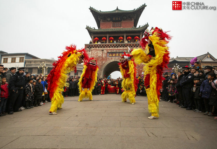2019年2月12日拍攝于河南省??h古城。人們相信獅子是祥瑞之獸,舞獅能夠帶來(lái)好運(yùn),所以每逢春節(jié)或其它一些慶典活動(dòng),都會(huì)在陣陣鑼鼓鞭炮聲中,舞獅助慶祈求吉利。一件花團(tuán)錦舞獅子,是中國(guó)優(yōu)秀的民間藝術(shù),每逢元宵佳節(jié)或集會(huì)慶典,民間都以獅舞前來(lái)助興。[攝影:趙軍]