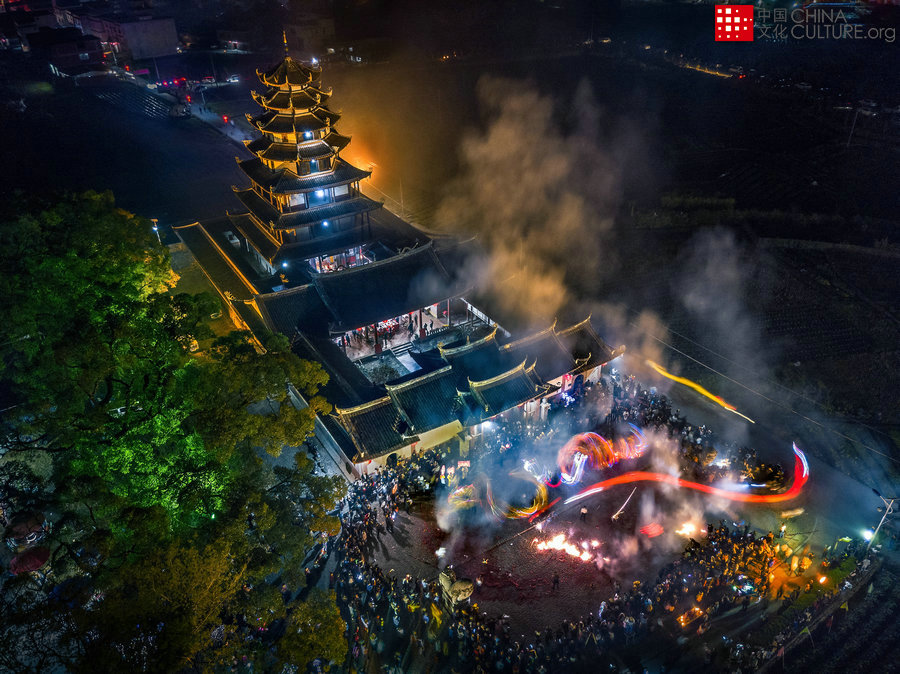 2019年2月拍攝于福建省龍巖市永定區(qū)。村民在天后宮舞龍鬧春,迎接新春。[攝影:張煒]