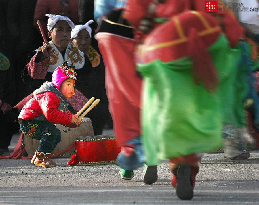 2013年2月20日拍攝于陜西隴縣。有著幾千年歷史的隴州社火,每到正月,各鄉(xiāng)鎮(zhèn)、各村組的社火,一家比一家耍紅火,如今連小孩子也喜歡上了這項(xiàng)活動(dòng),成了小小社火傳承人。[攝影:趙華]