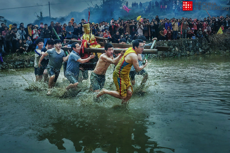 2019年2月6日拍攝于福建省龍巖市。龍巖市客家山村童坊鎮(zhèn)舉河村,春節(jié)正月十二鬧春田,村民把關(guān)公菩薩抬進(jìn)田里追逐,祈福豐年,喜慶新春佳節(jié)。[攝影:江慶端]