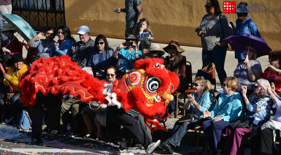 2020年2月1日拍攝于美國洛杉磯中國城。美國歷史最悠久、規(guī)模最大的中國農(nóng)歷新年慶?;顒?dòng)、洛杉磯第121屆金龍大游行在中國城熱鬧舉行。近百個(gè)花車、舞獅舞龍隊(duì)、樂隊(duì)、功夫武術(shù)隊(duì)等慶祝中國農(nóng)歷新年鼠年來臨。[攝影:盧威]