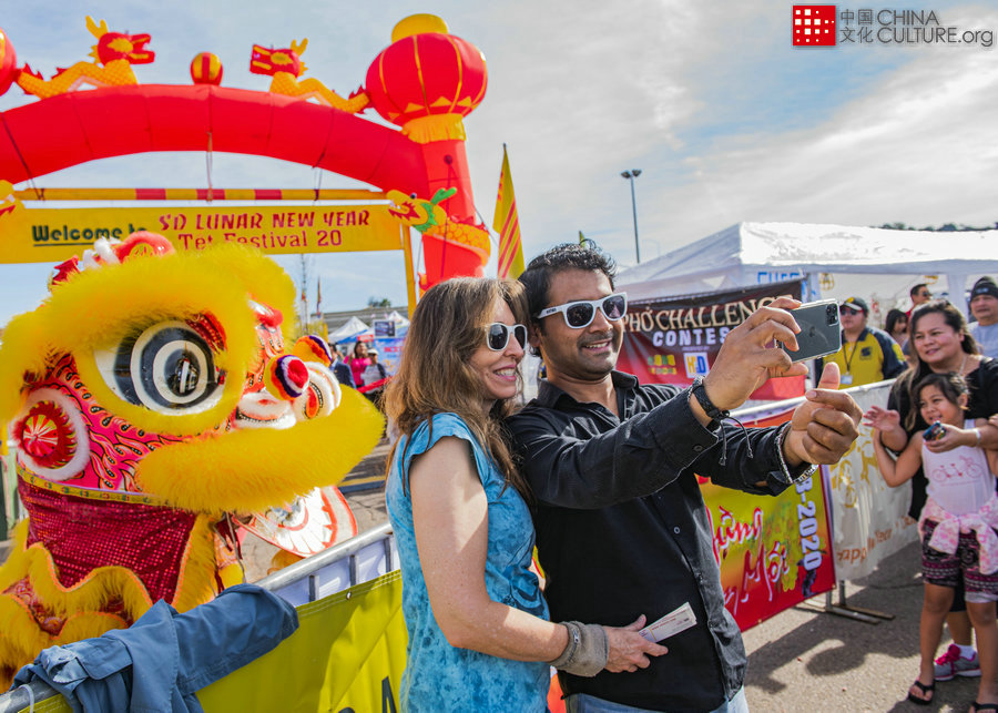 2020年1月19日,美國圣地亞哥市高通體育場春節(jié)游園,一對夫婦興致勃勃觀看舞獅并合影留念。[攝影:韋慶翔]