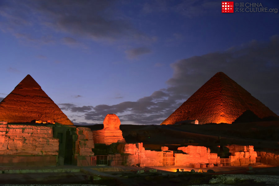 2020年1月23日,由開羅中國(guó)文化中心主辦的“2020金字塔·中國(guó)新年之夜”活動(dòng)在吉薩金字塔景區(qū)內(nèi)舉行。吉薩三座金字塔及獅身人面像同時(shí)點(diǎn)亮“中國(guó)紅”,慶祝中國(guó)農(nóng)歷新年的到來。[攝影:王文驍]