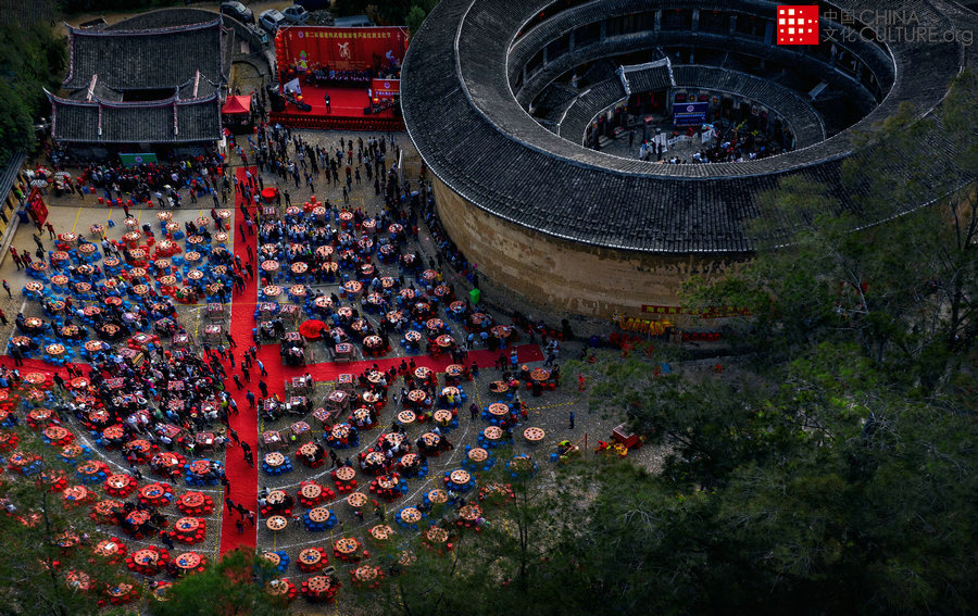 2018年12月拍攝于福建省漳州市平和縣。土樓人在土樓旁擺桌慶喜,迎接新春。[攝影:張煒]