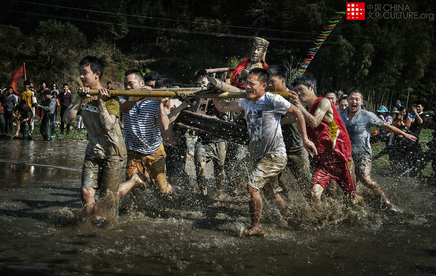 2018年3月1日拍攝于福建省龍巖市。福建省龍巖市客家山鄉(xiāng)童坊鎮(zhèn)舉河村,每到農(nóng)歷正月十二,都會舉辦鬧春田的傳統(tǒng)民俗活動。村民把關(guān)公菩薩抬進(jìn)田里追逐打轉(zhuǎn),寓意喚醒土地,祈福風(fēng)調(diào)雨順,作物豐收。[攝影:江慶端]