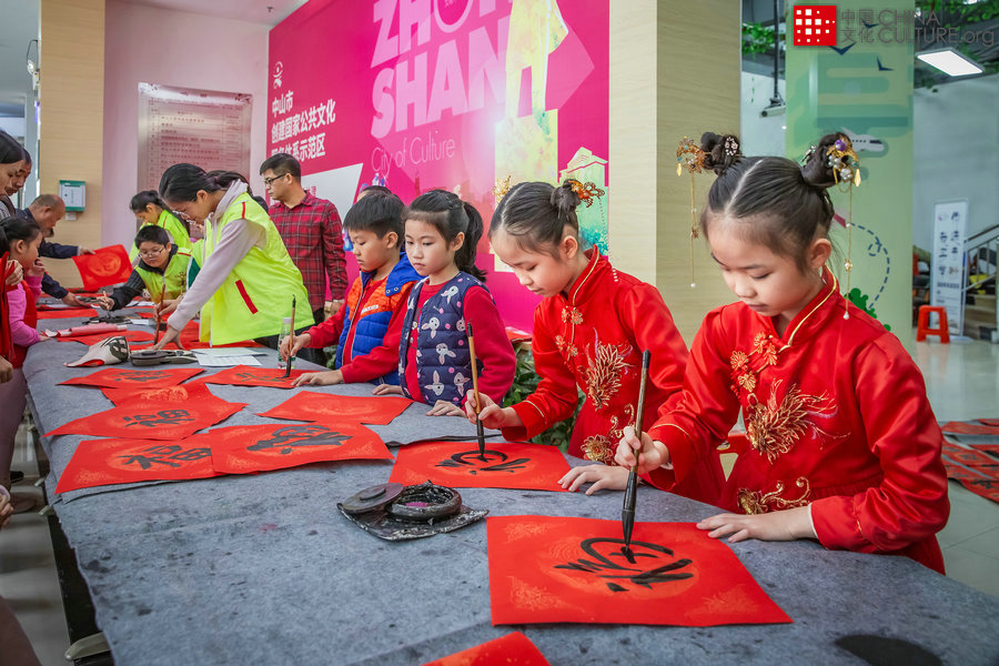 2020年1月11日拍攝于廣東中山市火炬開發(fā)區(qū)。廣東中山市火炬開發(fā)區(qū)文化站組織愛好書法的學(xué)生為市民現(xiàn)場書寫春聯(lián),為新春送上祝福。[攝影:曾學(xué)先]