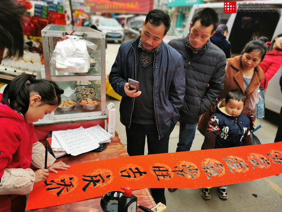 2020年1月20日,在廣西河池市鳳山縣長洲鎮(zhèn),一名小朋友在幫市民寫春聯(lián)。[攝影:周恩革]