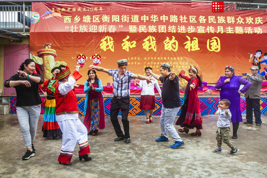 2020年1月1日拍攝于南寧中華社區(qū)。元旦新年,南寧中華中路社區(qū)卻熱鬧非凡。震耳欲聾的音樂響起來,社區(qū)人們與維吾爾族兄弟們聚在一起跳起歡快的舞蹈,感受幸福美滿生活。[攝影:梁燦芳]