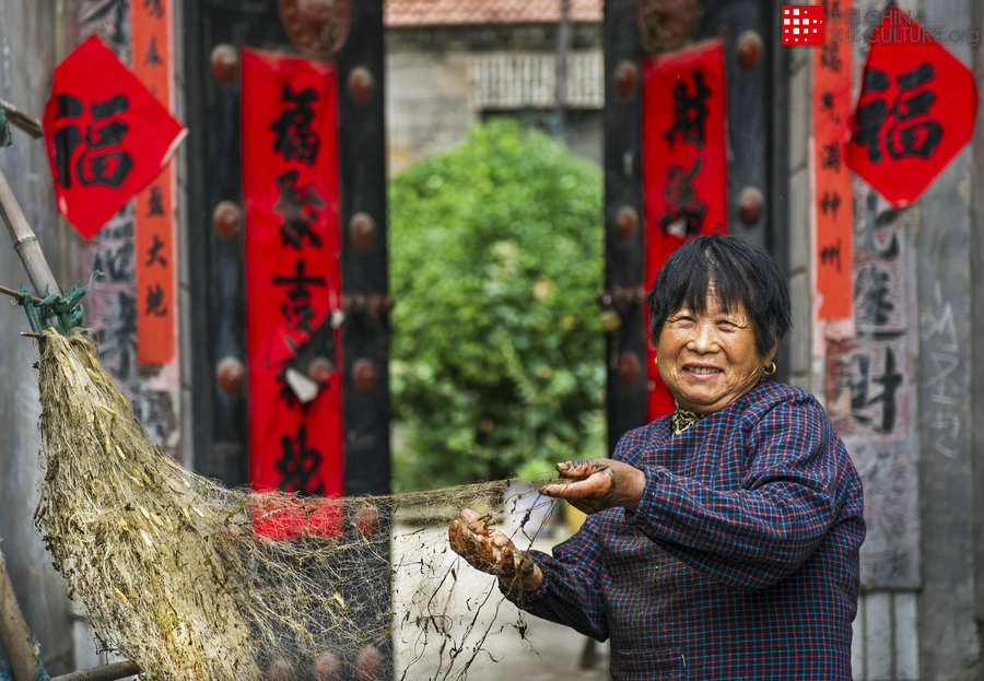 2017年1月27日拍攝于山東微山湖。山東微山湖漁村編織漁網(wǎng)。[攝影:韓翠芝]