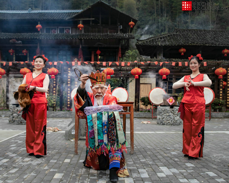 2020年1月17日拍攝于湖南會同縣。2020年元月17日(臘月23),在湖南省文旅廳駐村工作隊的指導(dǎo)下,雪峰村在村部百姓文化廣場舉辦了首屆鄉(xiāng)村春晚及民俗文化展示活動。巫儺祈福是非物質(zhì)文化遺產(chǎn),是民俗民間文化。[攝影:胡德江]