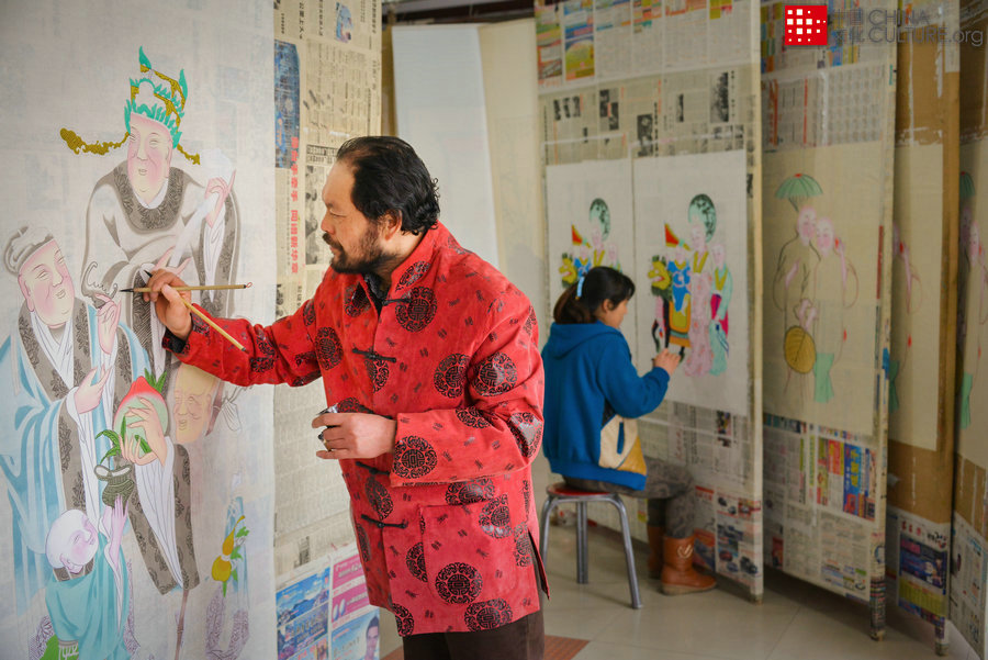 2013年拍攝于山東省高密市姜莊鎮(zhèn)。撲灰年畫是國家級非物質(zhì)文化遺產(chǎn),每到春節(jié),家家戶戶掛年畫,石建亭就是這一技藝的傳承人。[攝影:孫永杰]