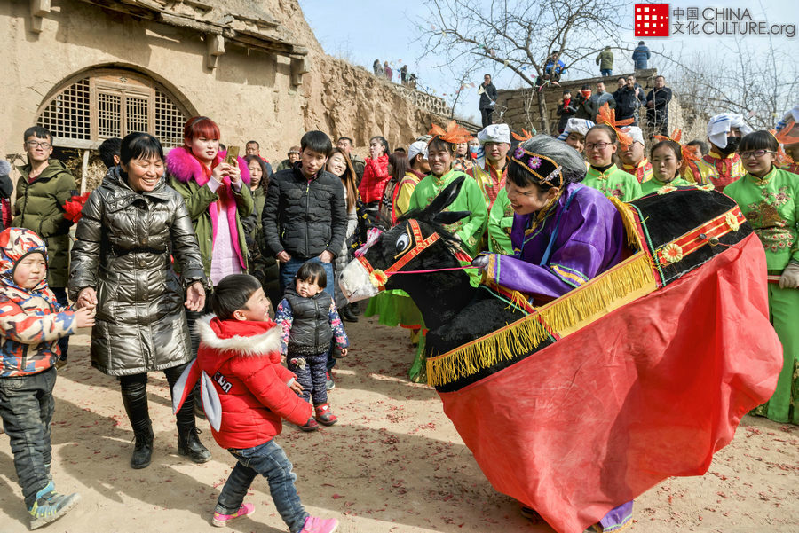 2017年1月31日拍攝于陜西省子洲縣西莊鄉(xiāng)黑豆墕村。紅紅火火鬧新春,男女老少皆歡喜。天真的小女孩看著跑驢非常開心。[攝影:吳志林]