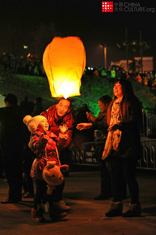 2013年2月11日拍攝于四川省雅安市雨城區(qū)。放飛孔明燈祈福未來,已成為人們?cè)诖汗?jié)期間喜聞樂見的活動(dòng)。[攝影:周志堅(jiān)]